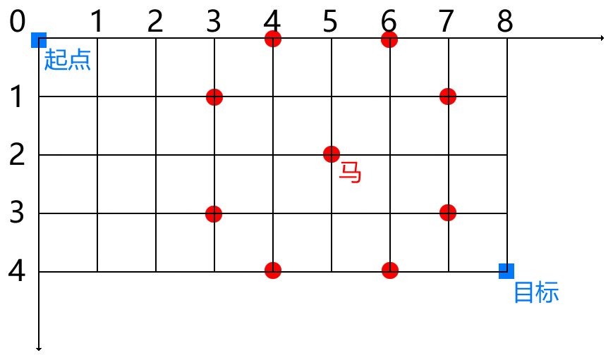例如下图,卒子的目的地的坐标是[4,8],马的坐标是[2,5],其他的红色点是马可以一步达到的位置。